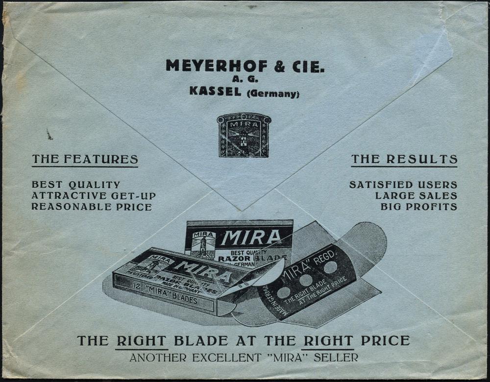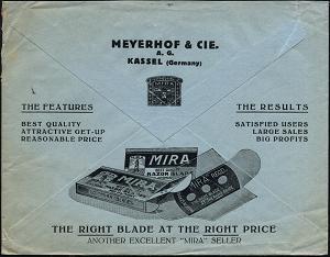 2248 | 20 € | 3500 Kassel Allgem. Belege : Kassel 1930 (10.11.) 20 Pf. Ebert, grau, reine MeF: 2 Stück, je Firmen-Lochung "M & Cie" = M eyerhof & Cie, rs. engl. Reklame-Text + Rasierklingen-Abb. (kleiner Klappenausriß) dekorativer Ausl.-Bf. (Mi.436 MeF , Perfin) | ![]() ![]() | |