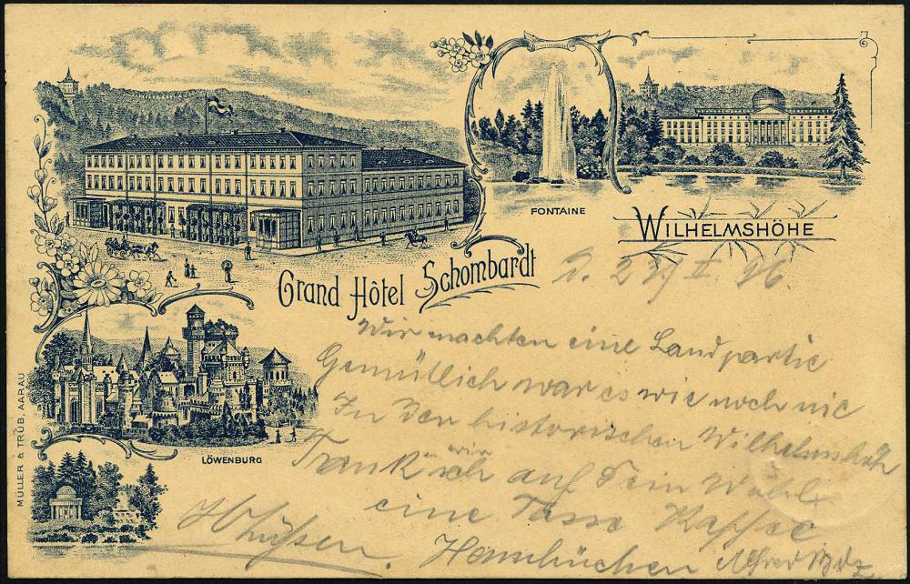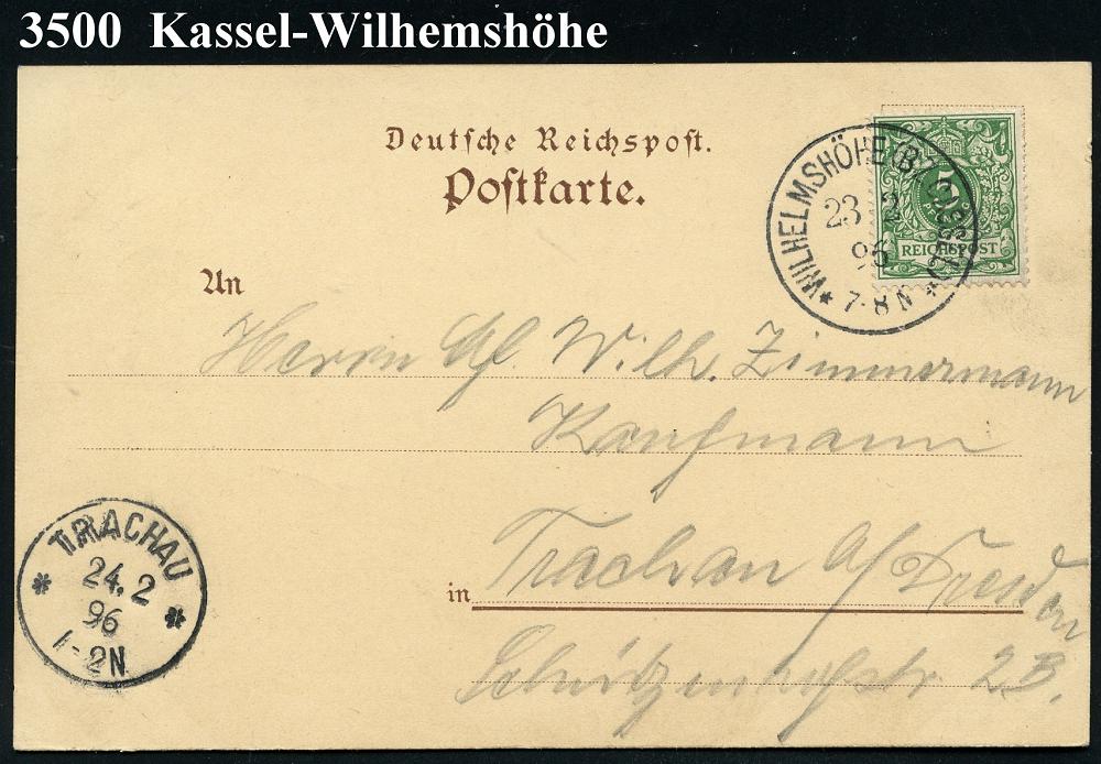 2229 | 30 € | 3500 Kassel Allgem. Belege : Kassel-Wilhelmshöhe 1896 (23.2.) 1K: WILHELMSHÖHE (BZ CASSEL)/** auf monochromer Litho-Ak.: Grand Hôtel Schombardt (+ 4 Ansichten: Schloß, Löwenburg etc.) Bedarf, selten! (Mi.46) | ![]() ![]() | |