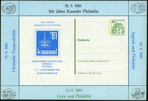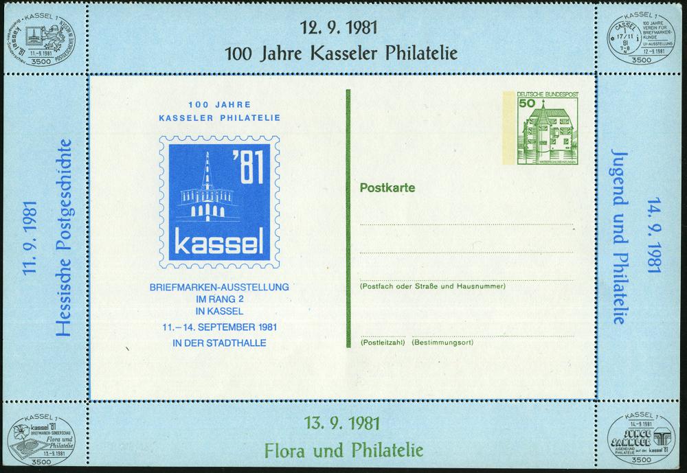 2265 | 16 € | 3500 Kassel Allgem. Belege : Kassel 1981 (Sept.) PP 50 Pf. Burgen, grün: 100 Jahre Kasseler Philatelie / kassel ´81 mit g e z ä h n t e m R a n d (Logo) = Herkules-Turm am Schloß (u. 4 Sonderstempel) ungebr., selten, war Beilage des Ausstellungs-Kataloges (Mi.PP 104/105) | ![]() | |