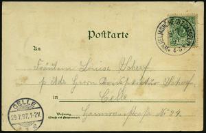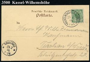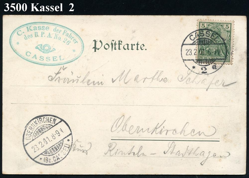 2234 | 18 € | 3500 Kassel Allgem. Belege : Kassel 1900 (23.2.) 1K-Gitter: CASSEL/* 2 d + grüner Oval-HdN: C. Kasse der Fahrer/des B.P.A. No.26/CASSEL (Posthorn) s/w.-Foto-Ak.: Cassel-Wilhelmshöhe Schloss, Bedarf n. Obernkirchen, vs.AS (Mi.55 EF) | ![]() ![]() | |