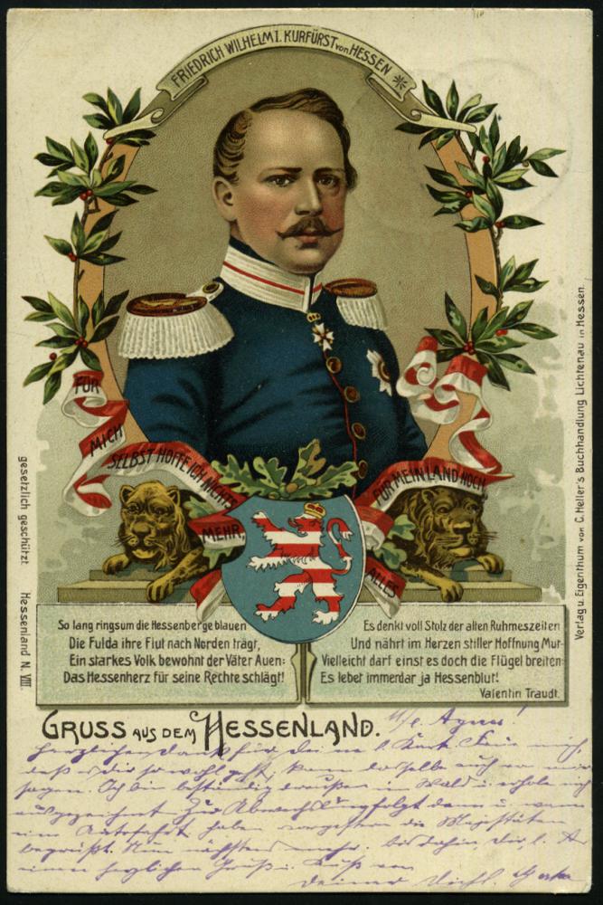 2236 | 18 € | 3500 Kassel Allgem. Belege : Kassel 1908 (16.8.) 1K-Gitter: CASSEL/*2m auf Color-Litho-Ak.: GRUSS AUS DEM HESSENLANDE.. / FRIEDR. WILHELM I. KURFÜRST v. HESSEN (in Uniform, Wappen, Löwen etc.) Bedarf n. Boppard , vs. AS (ex Collection B. de Perthuis) | ![]() ![]() | |