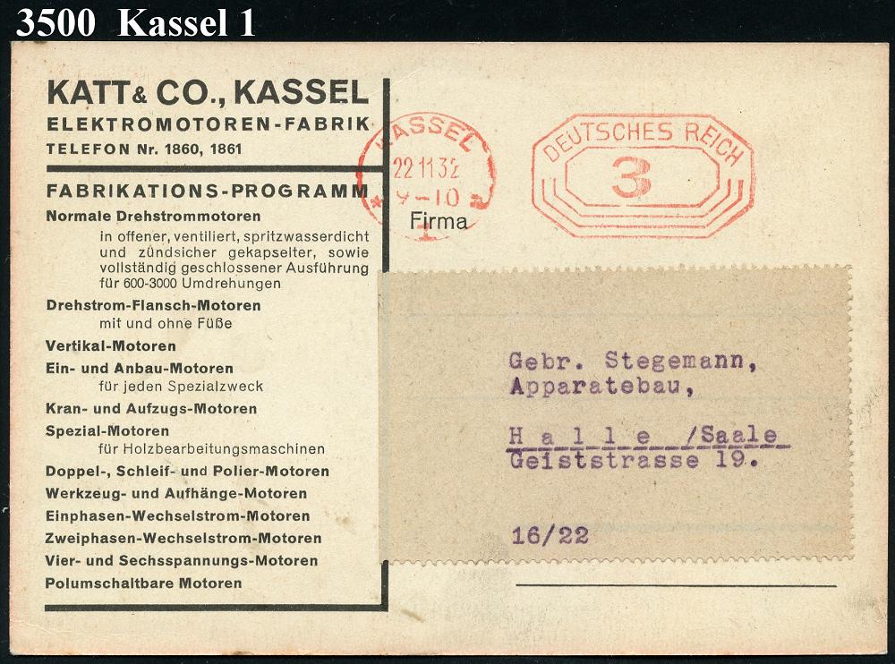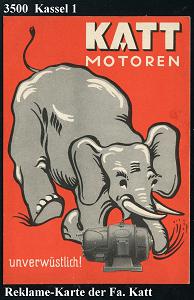 2249 | 18 € | 3500 Kassel Allgem. Belege : KASSEL/ *1a/ DEUTSCHES REICH 1932 (22.11.) PFS "Achteck" 3 Pf. auf zweifarbiger Reklame-Ak.: KATT MOTOREN unverwüstlich! (Elefant mit E-Motor) = Fa. Katt & Co., Elektromotoren-Fabrik, Fern-Kt. (Dü.D-4) | ![]() ![]() | |