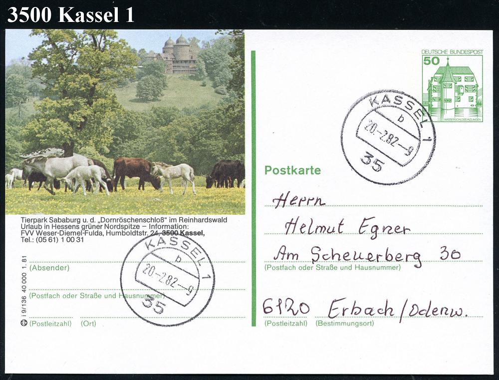 2267 | 14 € | 3500 Kassel Allgem. Belege : 35 KASSEL 1/ b 1982 (20.2.) 1K-Segment auf ortsgleicher BiP 50 Pf. Burgen, grün: Tierpark Sababurg u.d. "Dornröschen-schloß".. 3500 Kassel , klar gest. Inl.-Karte, seltene Kombination! (Mi.P 134/i 0-136) | ![]() | |