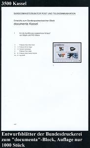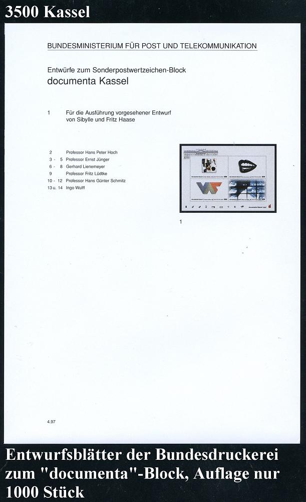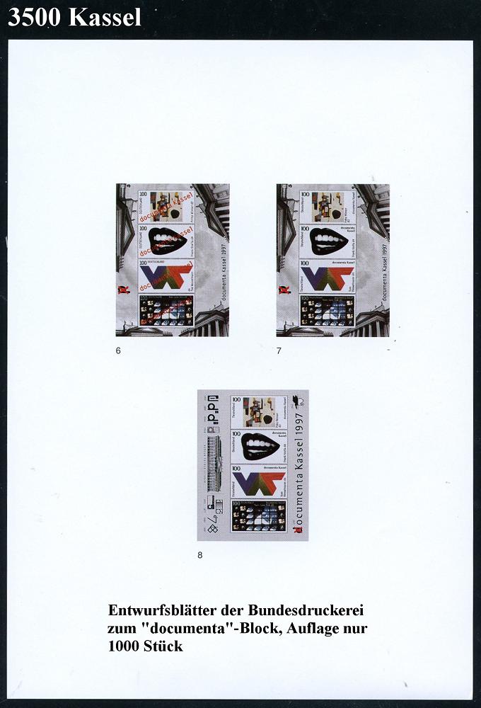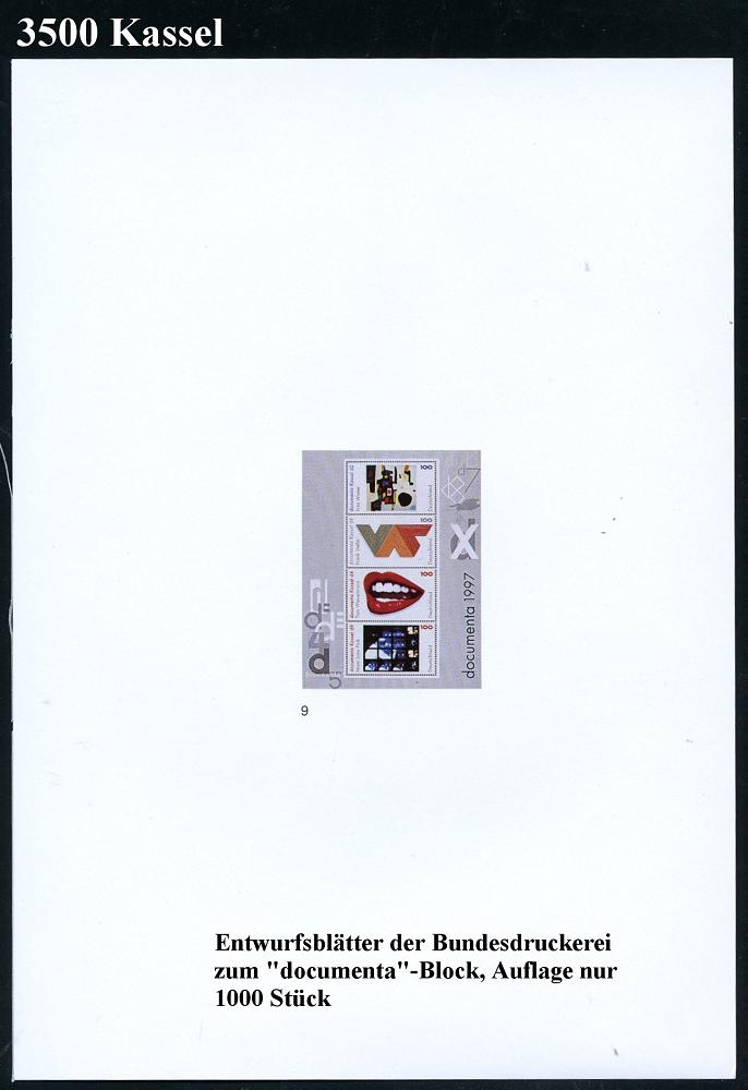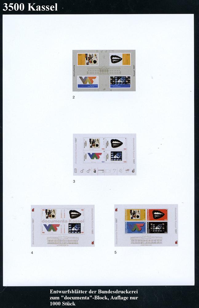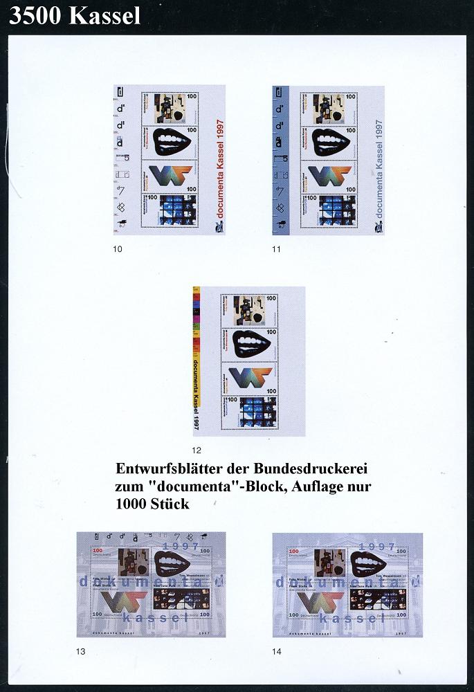 2268 | 25 € | 3500 Kassel Allgem. Belege : Kassel 1997 (Apr.) 100 + 100 + 100 + 100 Pf. "X. documenta" Kassel, 14 verschied. Color-Entwürfe der Bundesdruckerei auf 5 Entwurfsblättern kompl. (dabei Kunst von F. Winter, Q. Lamba, Tom Wesselmann, Nam June Paik u.a.), Aufl. nur 1000 (Mi.Bl. 39 etc.) | ![]() ![]() ![]() ![]() ![]() | |