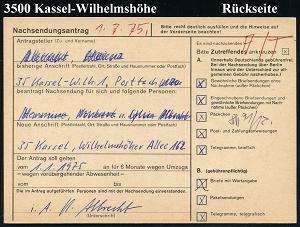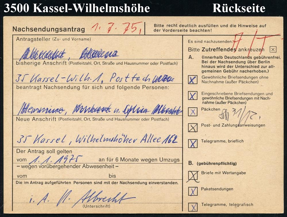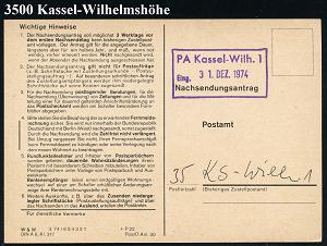 2263 | 12 € | 3500 Kassel Allgem. Belege : PA Kassel-Wilh.1 1974 (31.12.) viol. Ra.3 mit Datum auf unfrankiertem Orts-Nachsendeantrag (Form: DIN A6 Kl.317) | ![]() ![]() | |