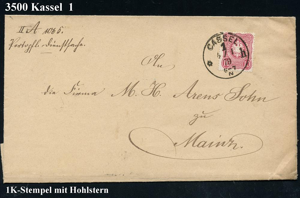 2228 | 16 € | 3500 Kassel Allgem. Belege : Kassel 1879 (4.1.) 1K: CASSEL/1/* h = Sonderform "Hohlstern" klar auf EF 10 Pfge. Adler, Dienstbf.-Hülle n.Mainz (Mi.33 EF) | ![]() | |