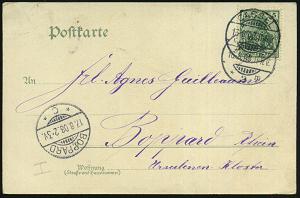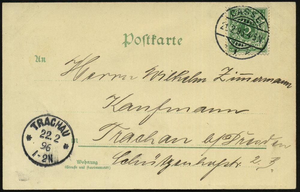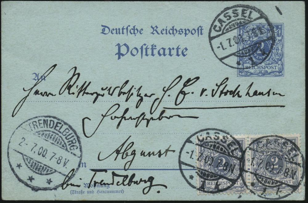 2233 | 15 € | 3500 Kassel Allgem. Belege : Kassel 1900 (1.7.) 1K-Gitter: CASSEL/* 1 k auf Orts-P 2 Pf. Krone, gau + Zusatzfrank. Paar 2 Pf. Krone (Mi.2x 52) Bedarfs-Inl.-Karte mit viel Text n. Trendelburg (AS) klar gest.! (Mi.P 40) | ![]() | |