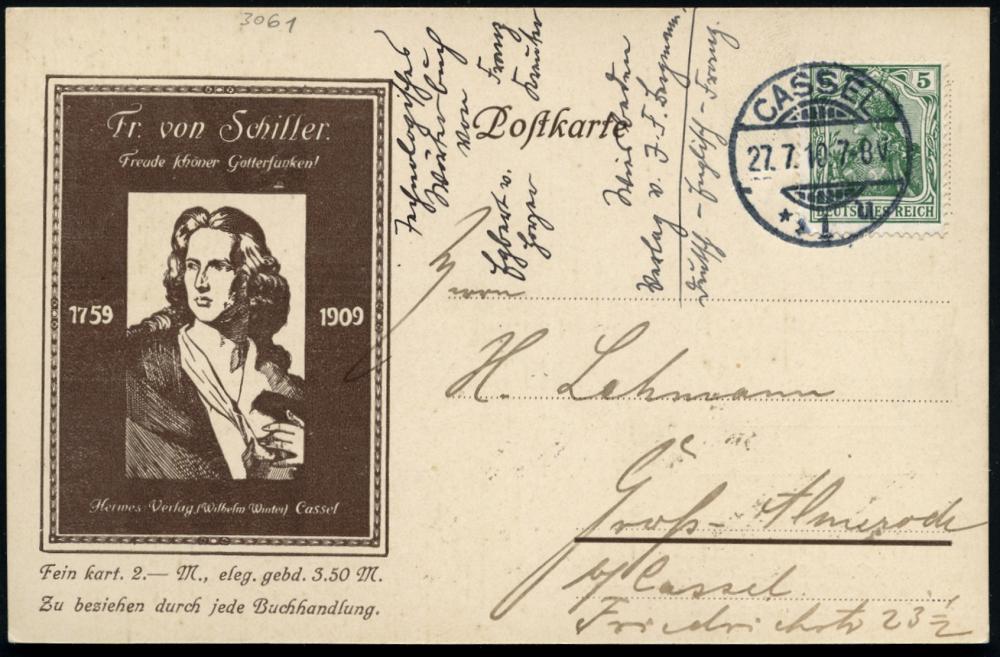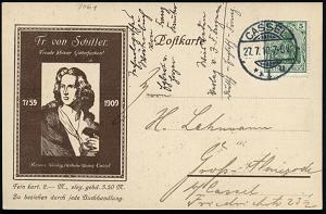 2237 | 16 € | 3500 Kassel Allgem. Belege : Kassel 1910 (27.7.) 1K-Gitter: CASSEL/*1u auf Reklame-Kt.: Friedrich von Schiller (Schiller-Brustbild) vom Hermes-Verlag, Cassel, Bedarf (Mi.85 I, EF) | ![]() | |