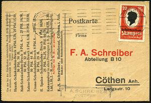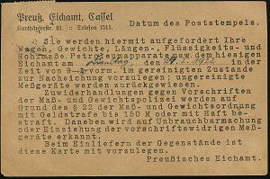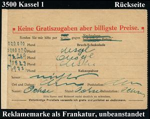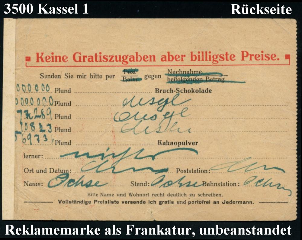 2239 | 18 € | 3500 Kassel Allgem. Belege : Kassel 1911 (9.10.) BdMaSt.: CASSEL/*1z auf Reklame-Marke 20 Pf. Das beste für die Haare/ Shampoon mit dem schwarzen Kopf! auf Firmen-Antwortkt. (Rand-Mängel) ohne Nachgebühr befördert!, Unikat! | ![]() ![]() | |