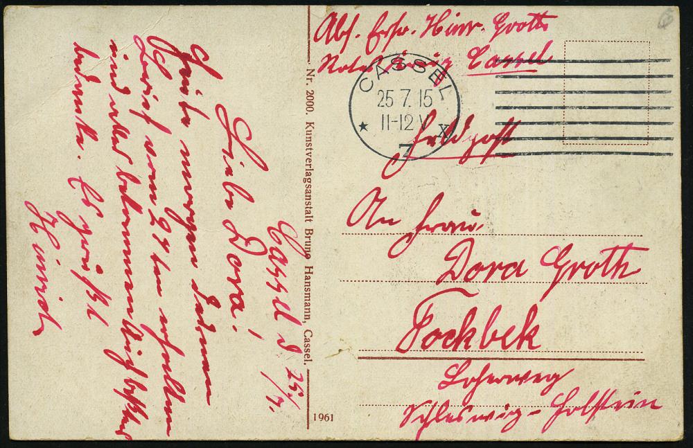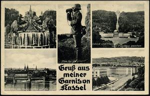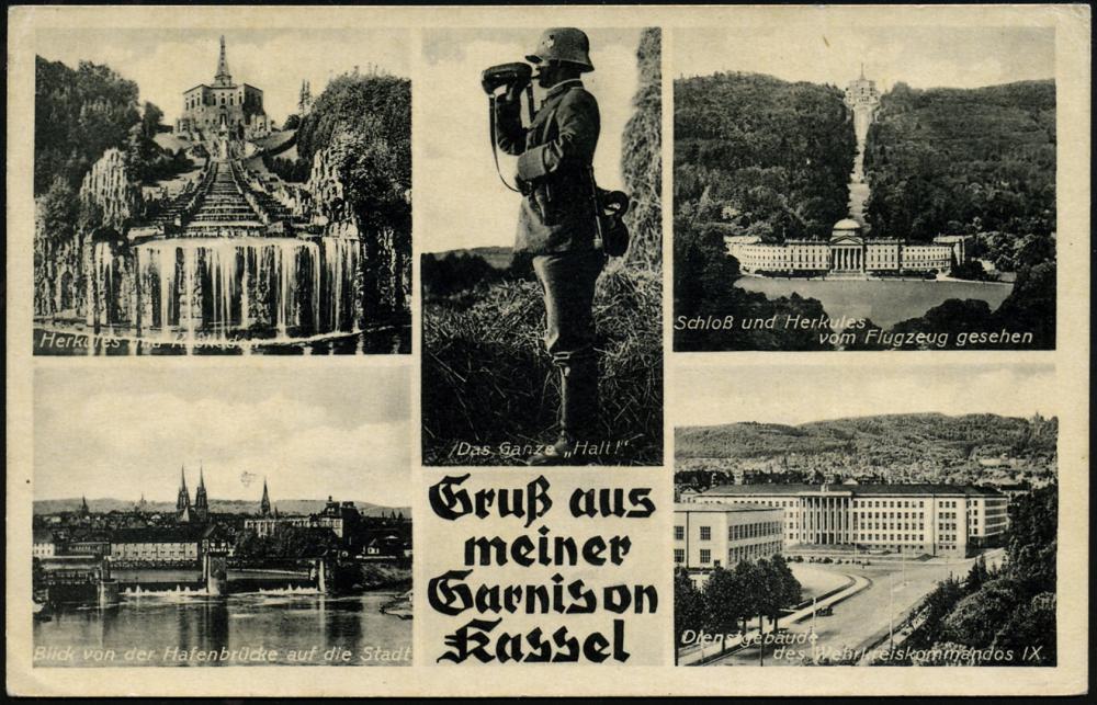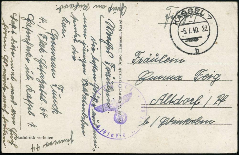 2253 | 16 € | 3500 Kassel Allgem. Belege : KASSEL 7/ b 1940 (6.7.) 2K-Steg + viol. 1K-HdN: 4. Flak-Ersatz-Abt. 64 + hs. Abs., s/w.-Feldpost-Foto-Ak.: Gruß aus meiner Garnison Kassel (5 Bilder, dabei Gebäude Wehrkreis-Kdo IX., Wehrmachtssoldat mit Signalhorn etc.) n. Altdorf | ![]() ![]() | |