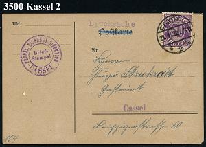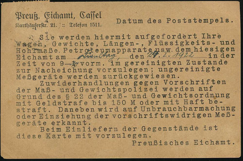 2244 | 20 € | 3500 Kassel Allgem. Belege : Kassel 1922 (21.1.) 1K-Brücke: CASSEL/* 2 m auf EF Dienst 50 Pf. + HdN: PREUSS.EICHUNGS-DIREKTION , interssante Mahn-Kt. zur Vorführung von Meßgeräten (Mi.D 21, EF 16.- EUR) | ![]() ![]() | |