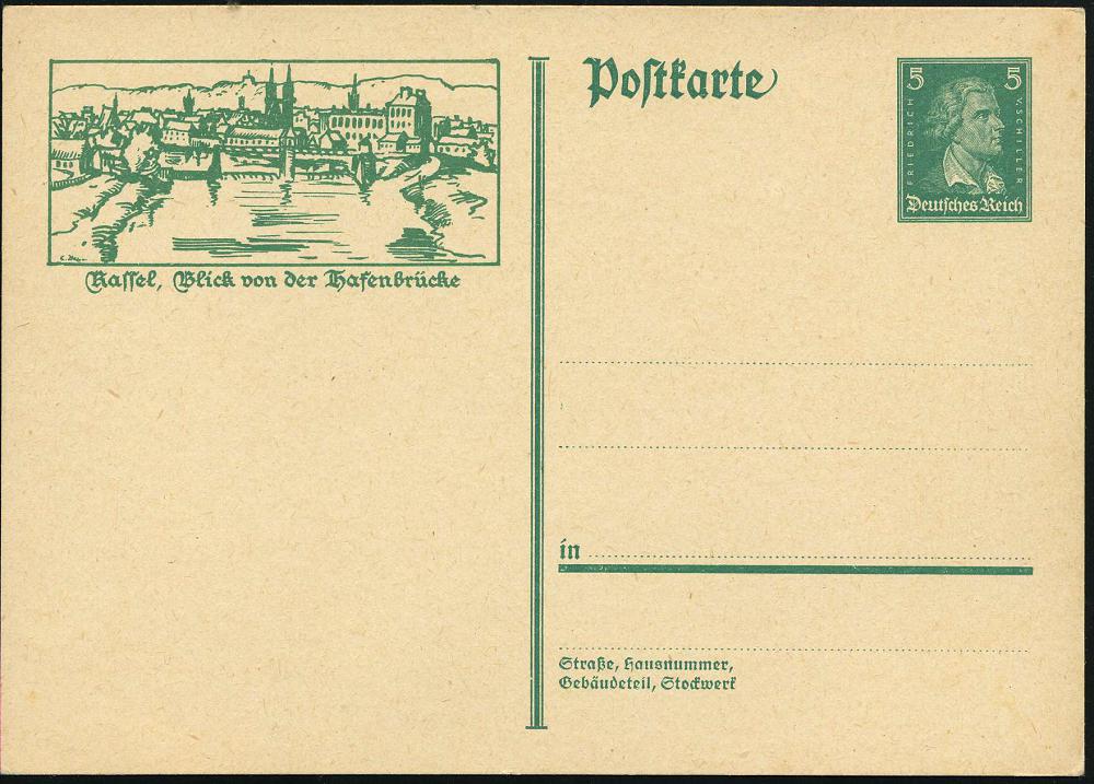 2246 | 16 € | 3500 Kassel Allgem. Belege : Kassel 1927 5 Pf. BiP Schiller, grün: Blick von der Hafenbrücke (auf den Fluß Fulda u. die Stadt) ungebr. (Mi.P 174/02) | ![]() | |