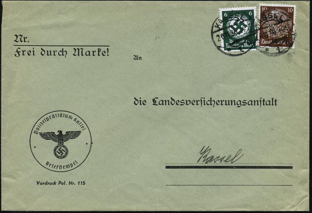 2251 | 25 € | 3500 Kassel Allgem. Belege : KASSEL/ *1d 1936 (26.11.) 1K-Brücke auf MiF 6 Pf. Behördendienst + 10 Pf. Hindenbg. mit "P O L"-Lochung , Dienst-Bf.: Frei durch Marke/ Polizeipräsidium Kassel (Vordruck Pol Nr. 115) Orts-Doppelbf. (Mi.D 135 + 521 Perfin) | ![]() | |