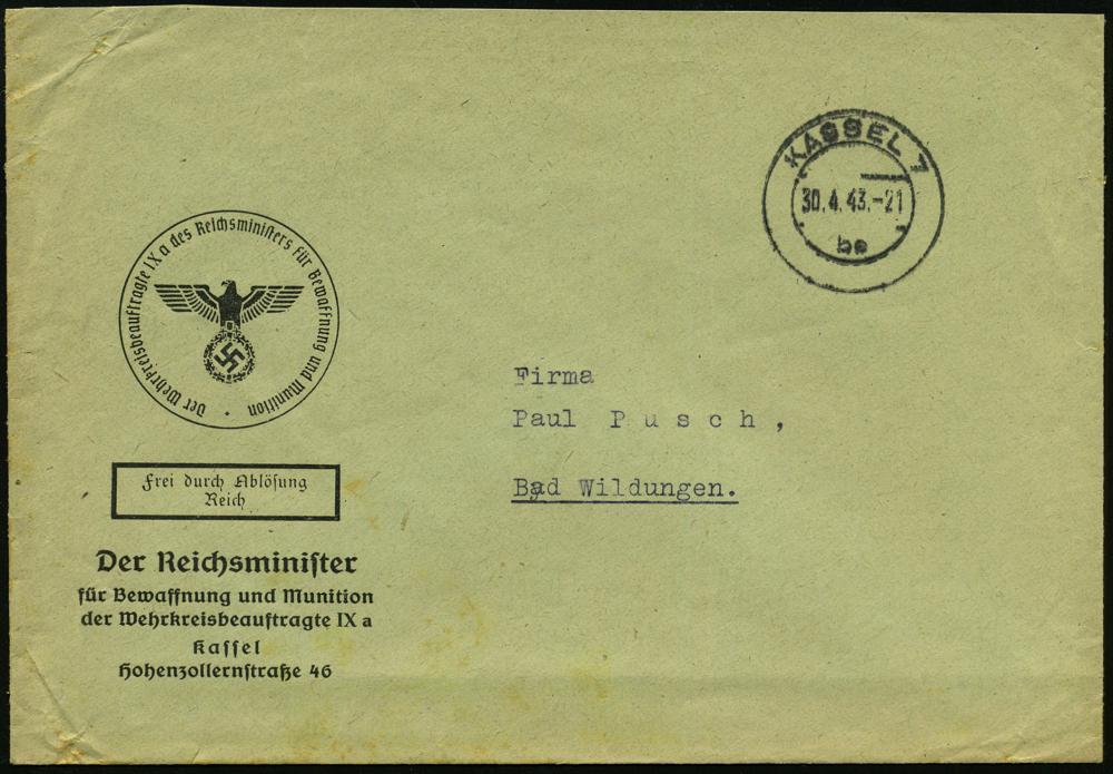 2254 | 20 € | 3500 Kassel Allgem. Belege : KASSEL 7/ be 1943 (30.4.) 2K-Steg auf Dienst-Bf.: Der Reichsminister für Bewaffnung u. Munition.. (NS-Adler) Minister = Albert Speer (Bf. kl. Fleckchen) seltener Fern-Bf. | ![]() | |
