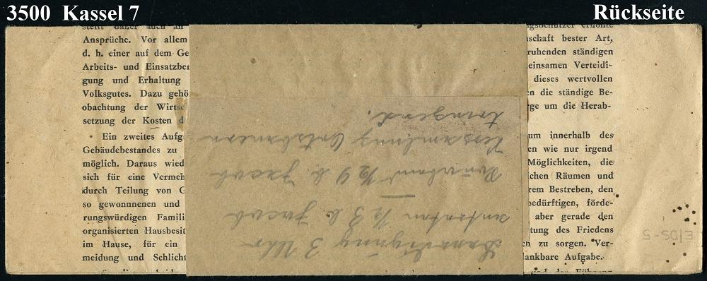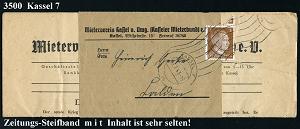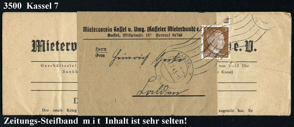 2255 | 30 € | 3500 Kassel Allgem. Belege : KASSEL 7/ rb 1943 (8.7.) Roll-WellenSt auf EF 3 Pf. Hitler, Zeitungs-Streiband: Mieterverein Kassel mit v o l l e m Inhalt: Mieterzeitung! (Zeitung Riß) komplett sehr selten! (Mi.782 EF) | ![]() ![]() | |