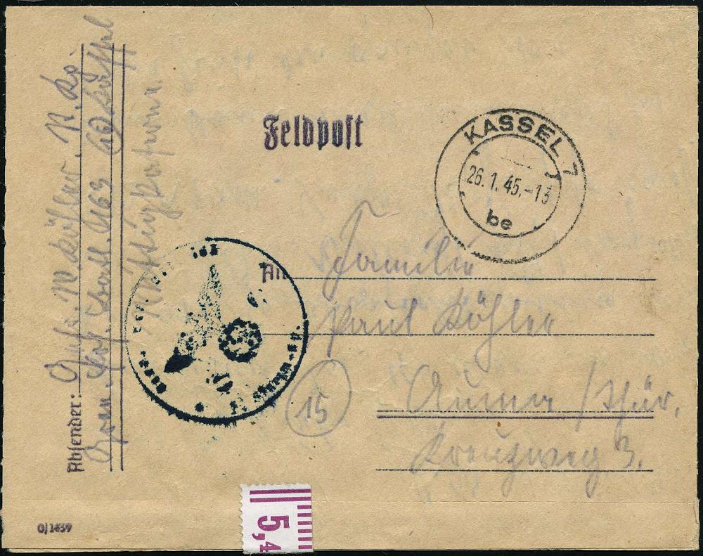 2256 | 18 € | 3500 Kassel Allgem. Belege : KASSEL 7/ be 1945 (26.1.) 2K-Steg + blauer 1K-Briefstempel + hs. Abs.: Gren.(adier) Ers. Batl. 193 "Wittigkaserne" , relativ später Feldpost-Faltbf. mit Inhalt n. (15) Auma | ![]() | |