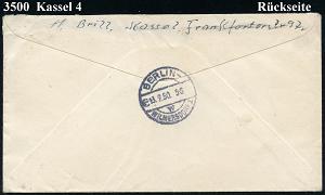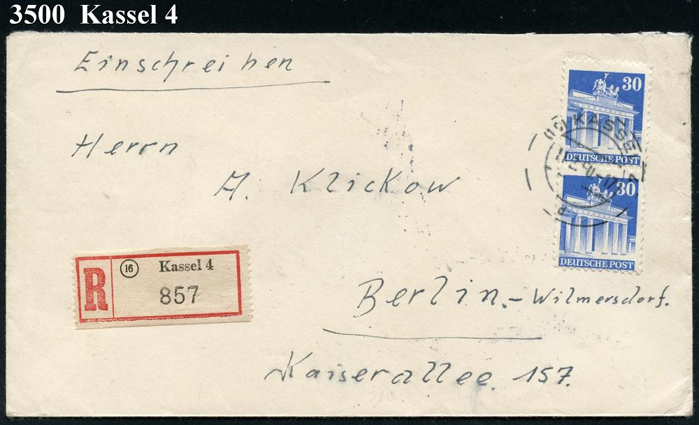 2257 | 15 € | 3500 Kassel Allgem. Belege : KASSEL 4/ d 1950 (11.2.) 2K-Steg auf Paar Bauten 30 Pf. Brandenbg.Tor, weit gez., , klar gest., notopferbefreiter Fern-R-Bf. n.West-Bln. (Mi.89 wg, MeF) | ![]() ![]() | |