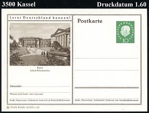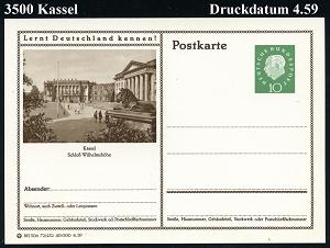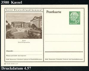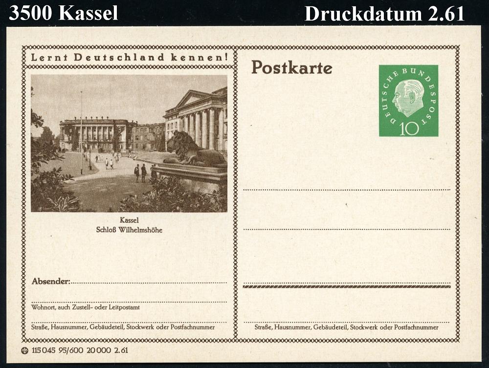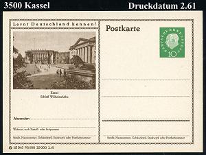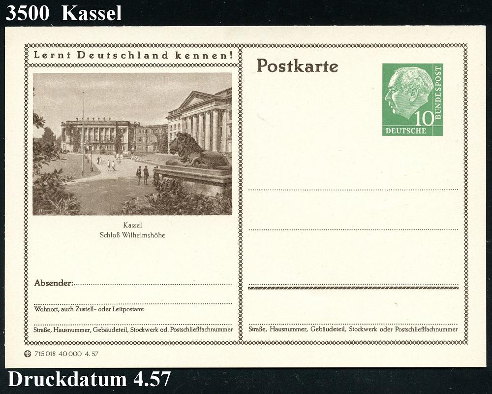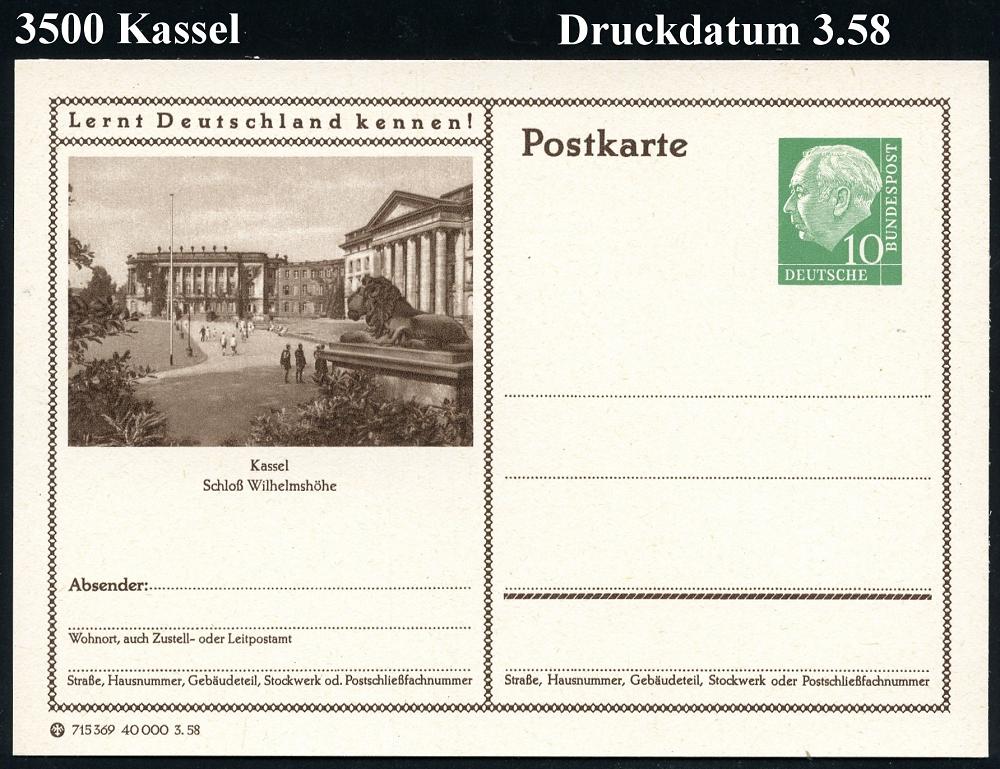2258 | 10 € | 3500 Kassel Allgem. Belege : Kassel 1957/58 10 Pf. BiP Heuss I, grün: Schloß Wilhelmshöhe mit 2 verschiedenen Druckdaten (mit Löwendenkmal) ungebr. Einzelverkauf möglich: je 6.- EUR (Mi.P 24) | ![]() ![]() | |