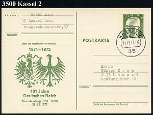2262 | 15 € | 3500 Kassel Allgem. Belege : 35 KASSEL 2/ d 1972 (21.12.) 1K-Segment auf Inl.-P 30 Pf. Heinemann, oliv + gleichfarbiger Zudruck: Grundvertrag BRD-DDR 21.12. (Reichs-u.Bundesadler) Orts-Karte, = Transit-Abkommen! (Mi.PZD 102) | ![]() | |