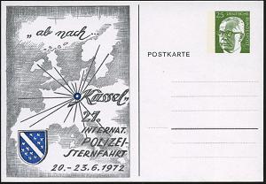 2261 | 12 € | 3500 Kassel Allgem. Belege : Kassel 1972 (Juni) PP 25 Pf. Heinemann: 27. INTERNAT. POLIZEI-/STERNFAHRT (Landkarte, Wappen) ungebr. (Mi.PP 45/9) | ![]() | |