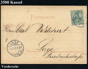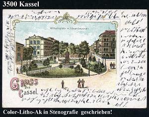2235 | 20 € | 3500 Kassel Allgem. Belege : Kassel 1902 (30.4.) Color-Litho-Ak.: GRISS aus Cassel, Wilhelmsplatz m. Löwenbrunnen , Bedarf n. Lage/Lippe, vs. AS (Mi.70) | ![]() ![]() | |