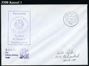 2264 | 15 € | 3500 Kassel Allgem. Belege : 35 KASSEL 1 SPA/ a 1980 (26.9.) 1K-Segment = S(oner) P(ost) A(amt) + viol. HdN: Postsache!/ POSTAMT KASSEL 1.. /(Sonder-postamt) (Bundesadler) + viol. HdN.: KASSEL/Die/Brüder-Grimm-/stadt (mit Abb.) Postdienst-Bf. | ![]() | |