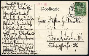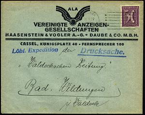 2245 | 18 € | 3500 Kassel Allgem. Belege : Kassel 1922 (26.8.) MaStrichSt.: CASSEL/* 1 * (7 Striiche rechts) auf EF 50 Pf. Ziffer aus Reklame-Bf.: ALA VEREINIGTE ANZEIGEN-GESELLSCHAFTEN, HAASENSTEIN & VOGLER AG.. (Ala-Logo) Infla-Drs.-Bf., vergl. Nr.2241 (Mi.183 EF) | ![]() | |