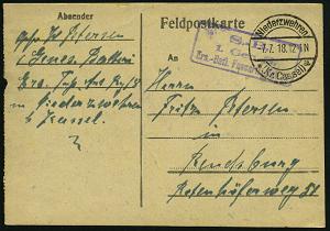 2269 | 14 € | 3500 Kassel Allgem. Belege : Niederzwehren/ *(Kr.Cassel)/ a 1918 (7.7.) 1K-Brücke + viol. Ra.3: S.B./1. Gen(senden) B(atterie) / Ers.-Batl. Fussartl. Rgt. 18 , klar gest. Feldpost-Kt. n. Rendsburg | ![]() | |