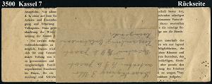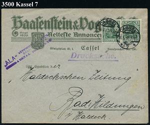 2241 | 18 € | 3500 Kassel Allgem. Belege : Kassel 7 1920 (18.5.) 1K-Brücke: CASSEL/7 auf Reklame-Bf.: Haasenstein & Vogler. Annoncenexpedition überstempelt mit 3L: "ALA VEREINIGTE ANZEIIGEN GESELLSCHAFT:.." , Paar 5 Pf. Germania, grün n. Bad Wildungen (Mi.85 II, MeF) | ![]() | |