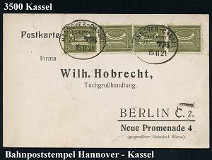 2243 | 16 € | 3500 Kassel Allgem. Belege : Kassel 1921 (15.2.) Bahn-Oval: HANNOVER - CASSEL/BAHNPOST/ZUG 776 2x auf 4er-Streifen Ziffer, Infla-Firmenkt. n.Bln (Mi.159 MeF) | ![]() | |