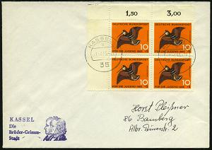 2260 | 15 € | 3500 Kassel Allgem. Belege : 35 KASSEL 14/ a 1966 (23.7.) 1K-Segment 2x auf 10 + 5 Pf. Waldschnepfe, reine MeF: Rand-4er-Block + viol. HdN: KASSEL/ Die Brüder-Grimm-Stadt, Inl.-Bf. (Mi.464 MeF = FDC) | ![]() | |