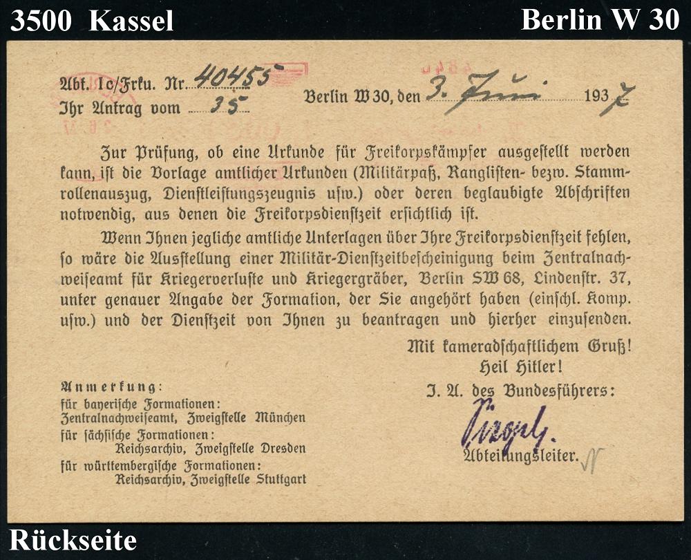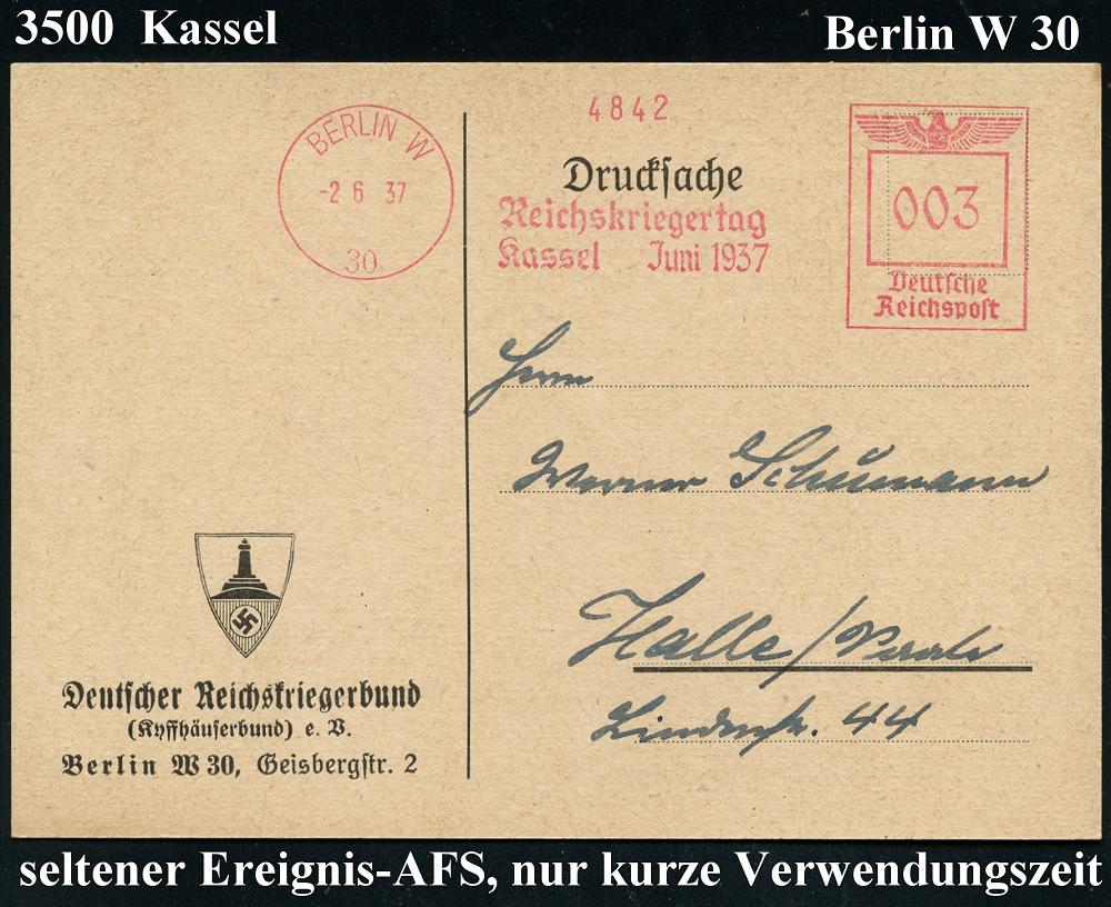 2363 | 50 € | 3500 Kassel Absender-Freistempel : BERLIN W/ 30/ Reichskriegertag/ Kassel Juni 1937 1937 (2.6) seltener AFS Francotyp "Reichsadler" auf illustrierter Vordruck-Kt.: Deutscher Reichskrieger-bund/ (Kyffhäuserbund) e.V. (neues Kyffhäuser-Logo jetzt mit Hakenkreuz!) rs. interess. Vordruck über Freikorps-kämpfer, seltener Beleg der Zeitgeschichte! (Dü.E-5CEh, nur kurze Verwendungszeit!) | ![]() ![]() | |