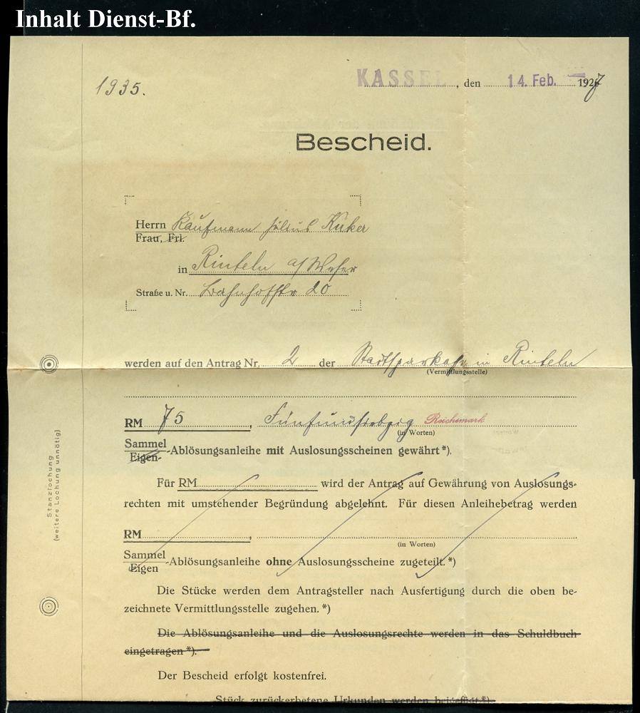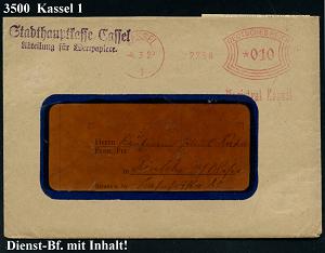 2364 | 35 € | 3500 Kassel Absender-Freistempel : KASSEL/ 1/ Magistrat.. 1927 (4.3.) AFS Francotyp "Bogenrechteck" + viol. Abs.-2L: Stadthauptkasse Cassel/Abteilung für Wertpapiere + Inhalt: Bescheid über Sammel-Ablösungs-Anleihe, 2 Belege kompl.!, mit Inhalt sehr selten! (Dü.E-1Am) | ![]() ![]() ![]() | |