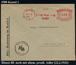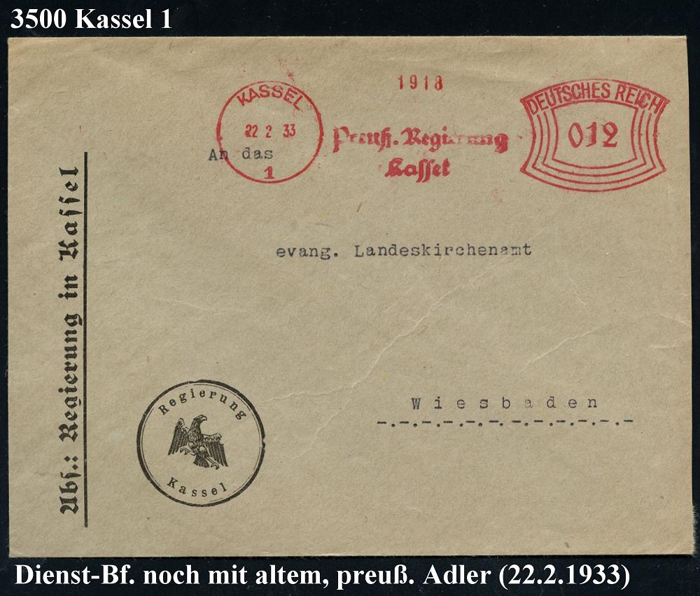 2371 | 20 € | 3500 Kassel Absender-Freistempel : KASSEL/ 1/ Preuß.Regierung 1933 (22.2.) AFS Francotyp "Bogenrechteck" aus der NS-Frühzeit auf dekorativem Dienst-Bf. noch mit altem preuß. Adler ohne Hakenkreuz n. Flensburg (Dü.E-1CEh) | ![]() ![]() | |