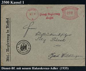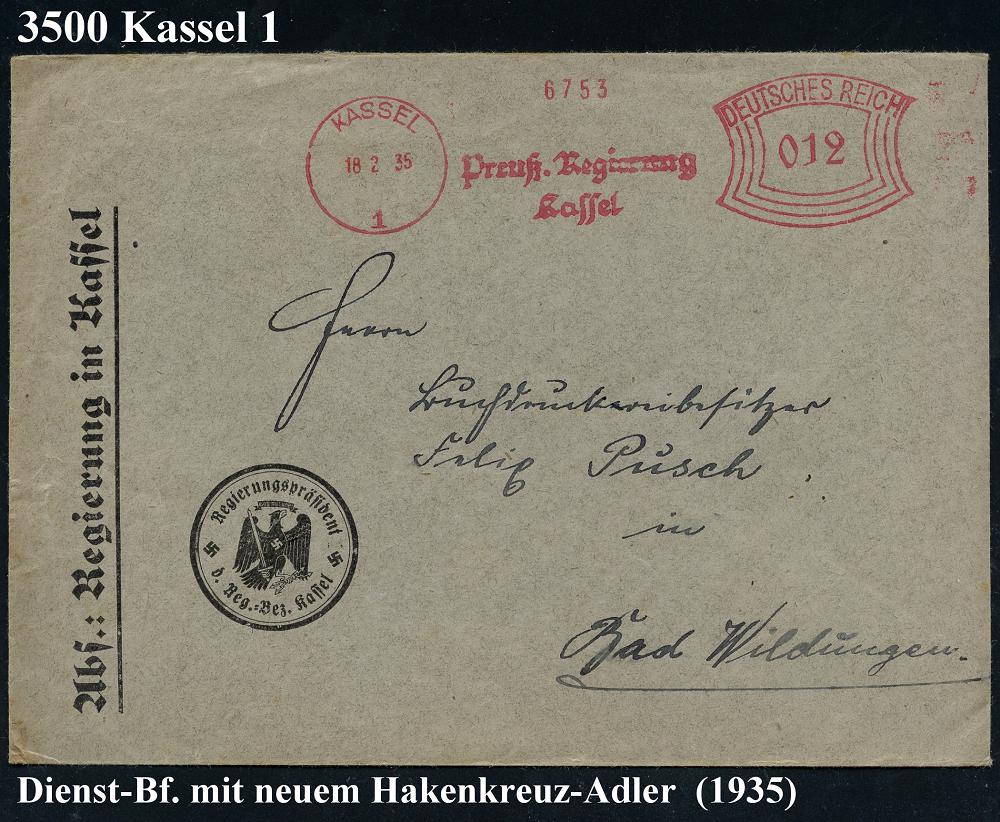 2379 | 20 € | 3500 Kassel Absender-Freistempel : KASSEL/ 1/ Preuß.Regierung 1935 (18.2.) AFS Francotyp "Bogenrechteck" auf Dienst-Bf.: Regierung in Kassel.. mit neuem Logo: preuß. Adler m i t Hakenkreuz: Regierungspräsident.. (vergl. Nr. 2371) n. Wildungen (Dü.E-1CEh) | ![]() | |