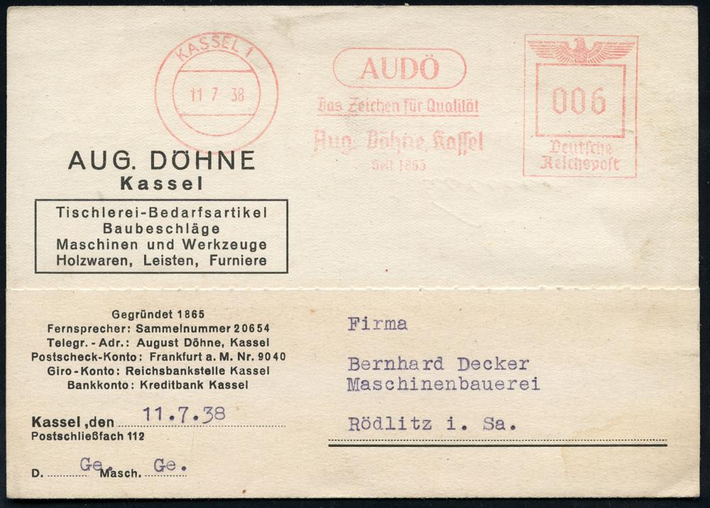 2394 | 18 € | 3500 Kassel Absender-Freistempel : KASSEL 1/ AUDÖ/ Das Zeichen für Qualität.. 1938 (11.7.) AFS Francotyp "Reichsadler" auf Firmenkt.: AUG. DÖHNE, Tischlerei-Bedarf.. Furniere (Dü.E-5CGo) | ![]() | |