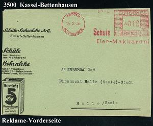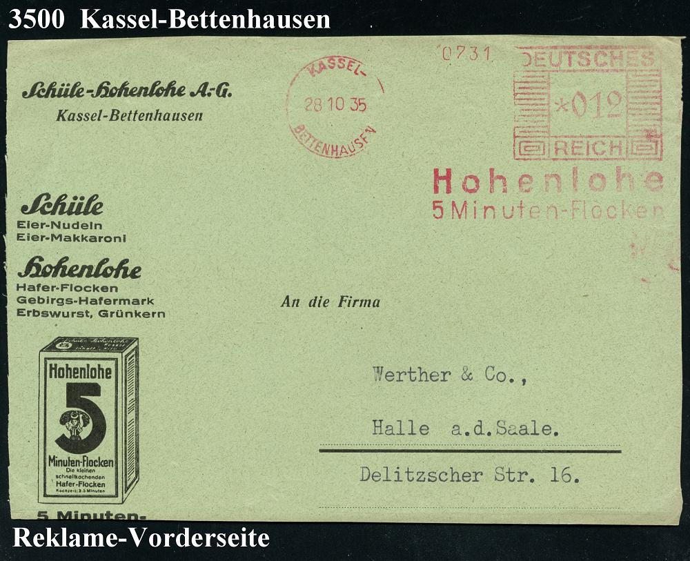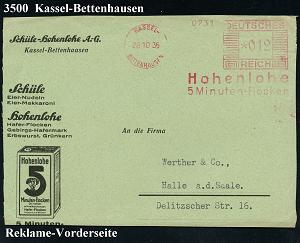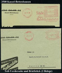 2381 | 25 € | 3500 Kassel Absender-Freistempel : KASSEL-/ BETTENHAUSEN/ Hohenlohe/ 5 Minuten-Flocken #bzw.# Schüle/ Eier-Makaroni 1935/36 2 verschied. AFS Francotyp "Mäanderrechteck" auf 2 Reklame-Vorderseiten: Schüle-Hohenlohe AG, 2 Belege! (Dü.E-2Ah) | ![]() ![]() | |