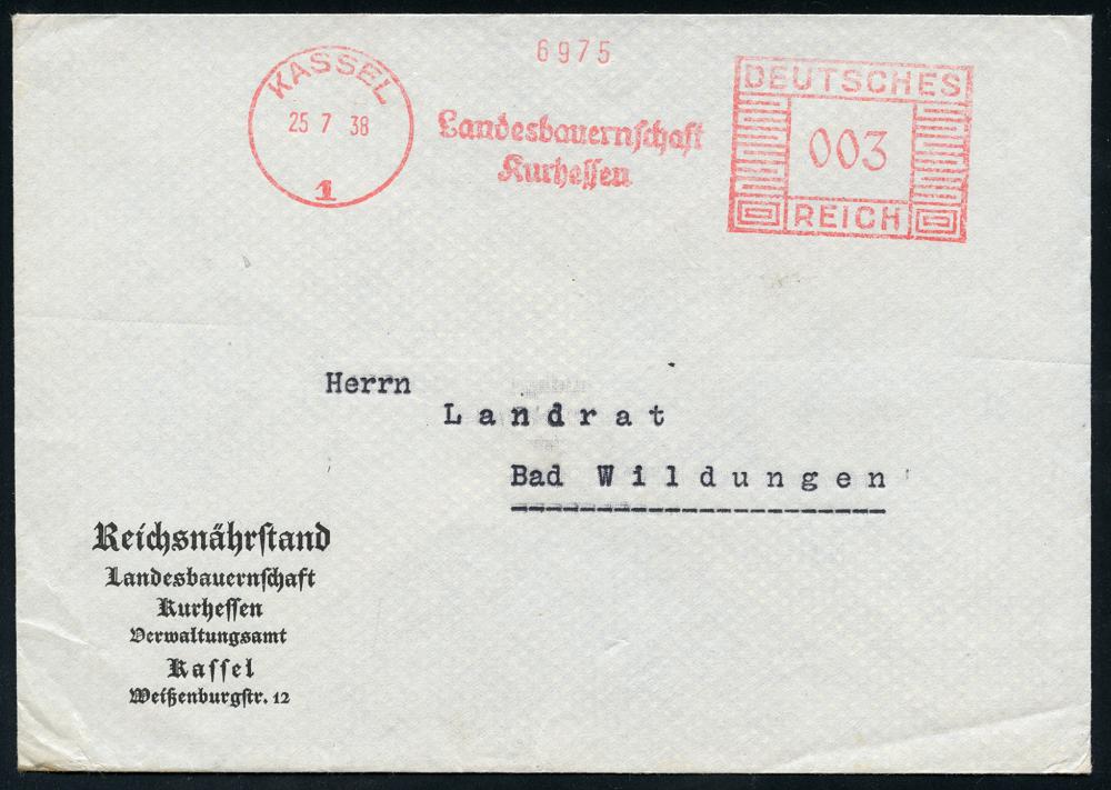 2395 | 23 € | 3500 Kassel Absender-Freistempel : KASSEL/ 1/ Landesbauernschaft/ Kurhessen 1938 (25.7.) AFS Francotyp "Mäanderrechteck" auf Dienst-Bf.: Reichsnährstand.., rs. großer Vordruck: Blut und Boden (NS-Logo), Fernbf. (Dü.E-2CEh) | ![]() ![]() | |