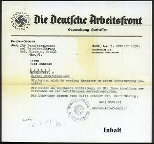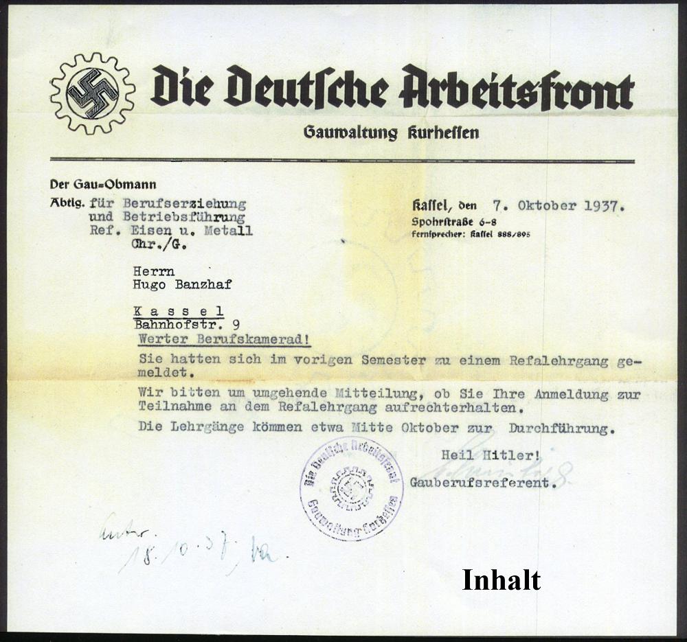 2388 | 28 € | 3500 Kassel Absender-Freistempel : KASSEL 1/ Die/ Deutsche Arbeitsfront/ Gauwaltung Kurhessen 1937 (7.10.) AFS Francotyp "Hakenkreuz" (DAF-Logo) = Hakenkreuz-Zahnrad , rs. Abs.-Vordruck, nachgesandter Orts-Bf. + Inhalt: DAF-Briefbogen mit großem DAF-Hakenkreuz-Wasserzeichen!, Nachporto 4 Pf. = Differenz zum Fernporto!, 2 Belege kompl. mit Inhalt selten! (Dü.E-3CEh) | ![]() ![]() | |
