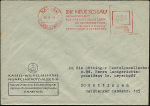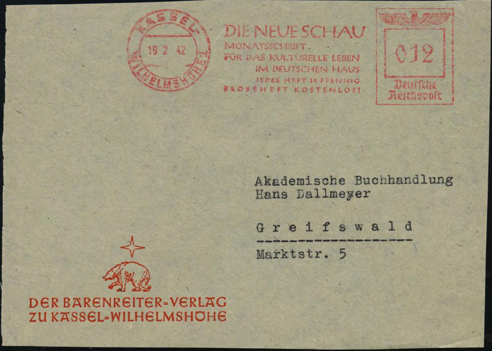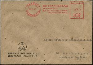 2408 | 16 € | 3500 Kassel Absender-Freistempel : KASSEL-/ WILHELMSHÖHE 1/ DIE NEUE SCHAU/ MONATSSCHRIFT/ FÜR DAS KULTURELLE LEBEN.. 1942 (19.2.) AFS Francotyp "Reichsadler" auf Firmen-Vorderseite mit Firmen-Logo: DER BÄRENREITER-VERLAG (Dü.E-5CEo) | ![]() | |