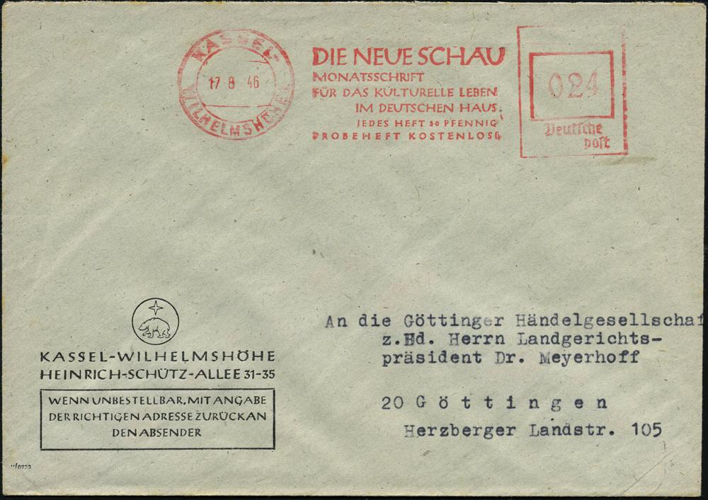 2412 | 25 € | 3500 Kassel Absender-Freistempel : KASSEL-/ WILHELMSHÖHE 1/ DIE NEUE SCHAU/ MONATSCHRIFT/ FÜR DAS KULTURELLE LEBEN/ IM DEUTSCHEN HAUS.. 1946 (17.8.) seltener, aptierter AFS Francotyp "Reichsadler" = entfernt + "Reichs" = Notmaßnahme , Firmen-Bf. (mit Bären-Logo) an Göttigner Händel-Gesellschaft (Dü.E-13C-107o) | ![]() | |