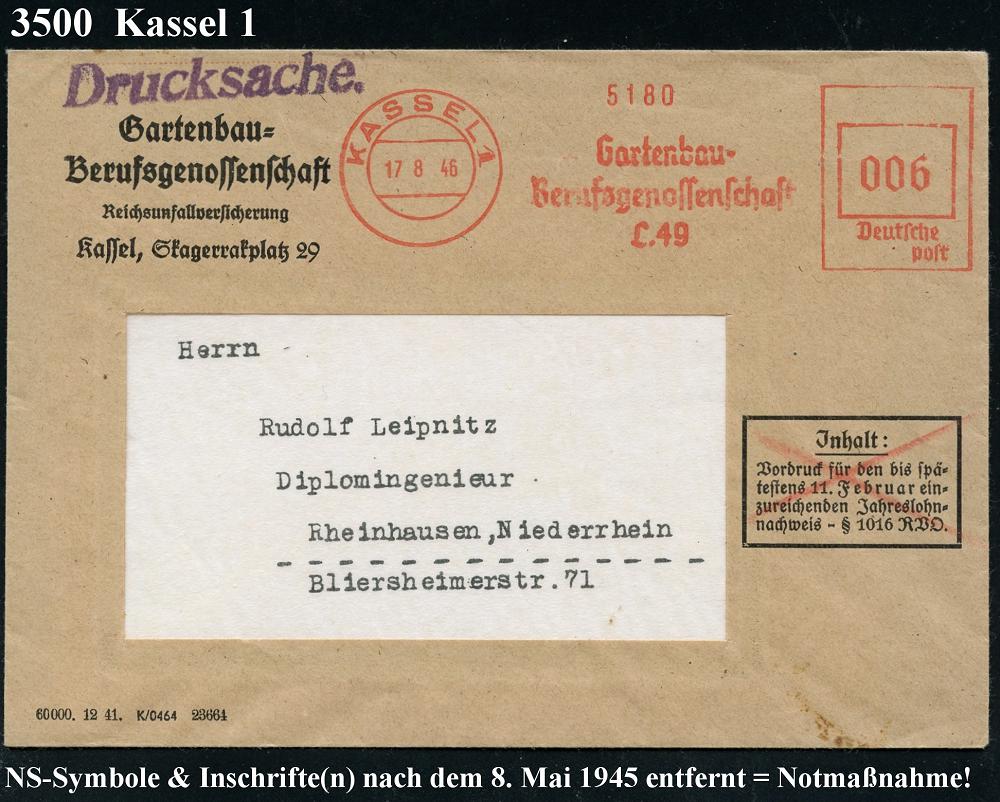 2413 | 25 € | 3500 Kassel Absender-Freistempel : KASSEL 1/ Gartenbau-/ Berufsgenossenschaft/ L.49 1946 (17.8.) aptierter AFS Francotyp "Reichsadler" = entfernt + "Reichs" = Notmaßnahme! klar gest. Vordruck-Bf., alter Vordruck von 1941!, seltene Inl.-Drs. (Dü.E-13 Y-129h) | ![]() | |