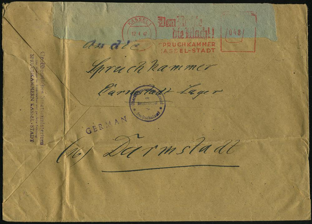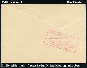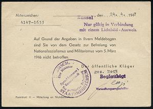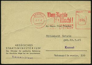 2419 | 35 € | 3500 Kassel Absender-Freistempel : KASSEL 1/ Dem Rechte/ die Macht!/ SPRUCHKAMMER/ KASSEL-STADT 1947 (5.5.) seltener, aptierter AFS Postalia "NS-Adlerkopf" = entfernt, 006 Pf. = Notmaßnahme , Dienst-Kt.: HESS. STAATSMINISTERIUM, Der Minister für polit. Befreiung, Der öffentliche Kläger bei der Spruchkammer (Querbugspur), Dienst-HdN, Entlastungs-Mitteilung = sogen. "Persilschein", seltene Orts-Kt. (Dü.E-15 E) | ![]() ![]() | |