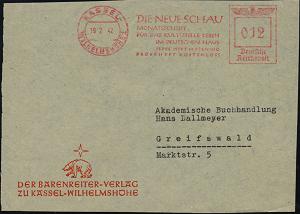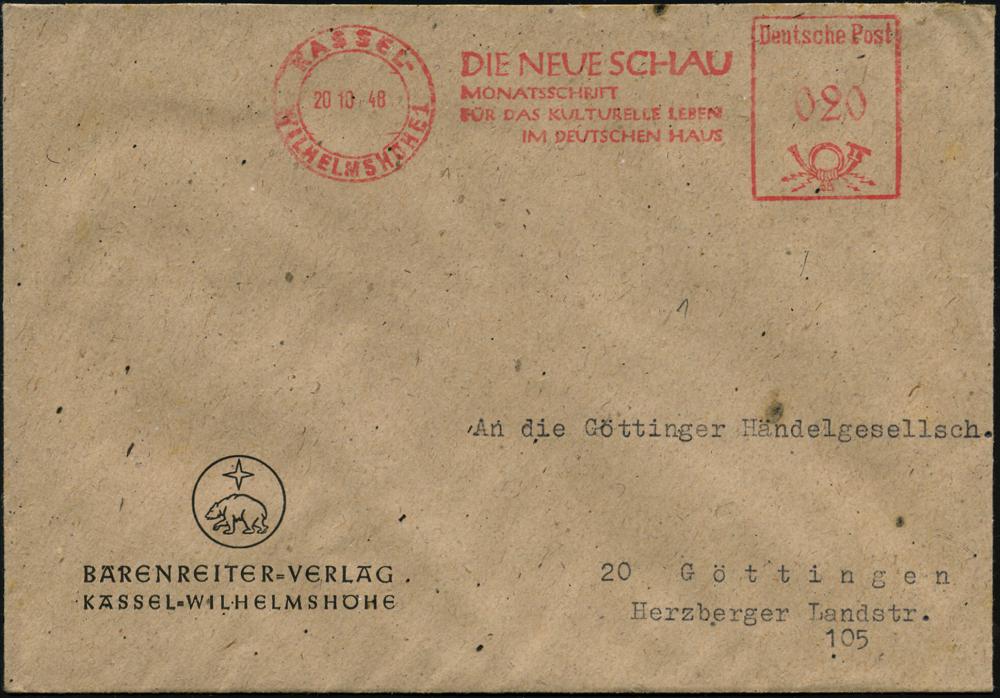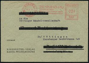 2422 | 18 € | 3500 Kassel Absender-Freistempel : KASSEL-/ WILHELMSHÖHE 1/ DIE NEUE SCHAUMONATSZEITSCHRIFT... 1948 (20.10.) AFS Francotyp "Posthorn - Deutsche Post" auf Firmen-Bf.: BÄRENREITER-VERLAG mit Bären-Logo an Göttinger Händel-Ges. (Dü.E-20CEo) | ![]() | |
