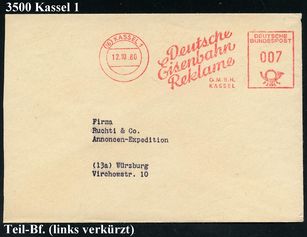2433 | 12 € | 3500 Kassel Absender-Freistempel : (16) KASSEL 1/ Deutsche/ Eisenbahn/ Reklame/ GMBH 1961 (Okt.) AFS Francotyp "Posthorn" klar auf (links verkürztem) Teil-Bf. (Dü.E-23CO) | ![]() ![]() | |