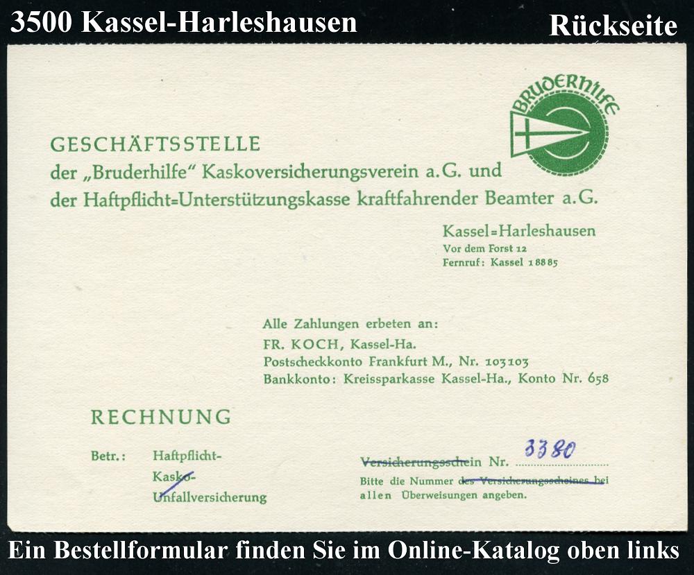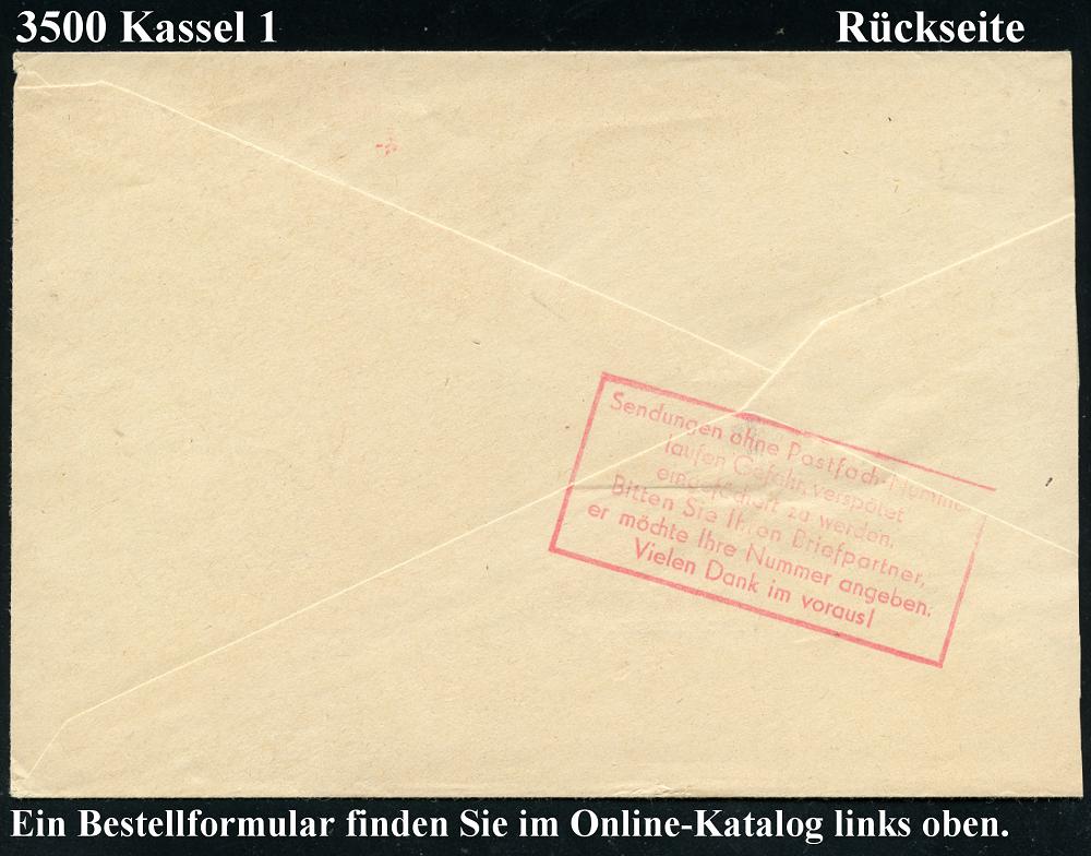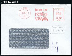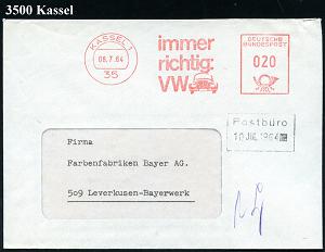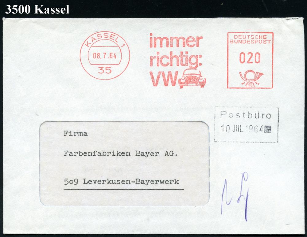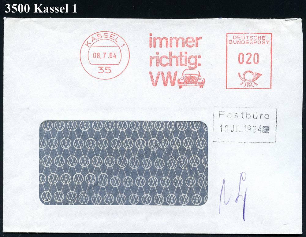 2437 | 16 € | 3500 Kassel Absender-Freistempel : 35 KASSEL 1/ immer/ richtig:/ VW 1964 (8.7.) AFS Francotyp "Posthorn" (= VW-Käfer) klar gest..VW-Reklame-Bf. (innen VW-Logo mehrfach !) Fern-Bf. (Dü.E-23CO) | ![]() ![]() | |