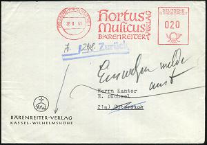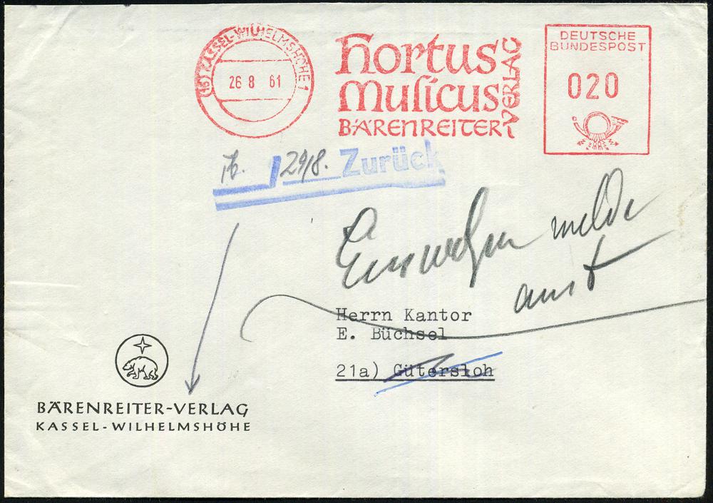 2434 | 15 € | 3500 Kassel Absender-Freistempel : (16) KASSEL-WILHELMSHÖHE 1/ Hortus/ Musicus/ BÄRENREITER/ VERLAG 1961 (26.8.) AFS Francotyp "Posthorn" + blauer 1L: Zurück von Gütersloh (mit hs. Datum) Firmen-Retour-Bf. (rs. Klappenausriß) n. Gütersloh (Dü.E-23CO) | ![]() | |