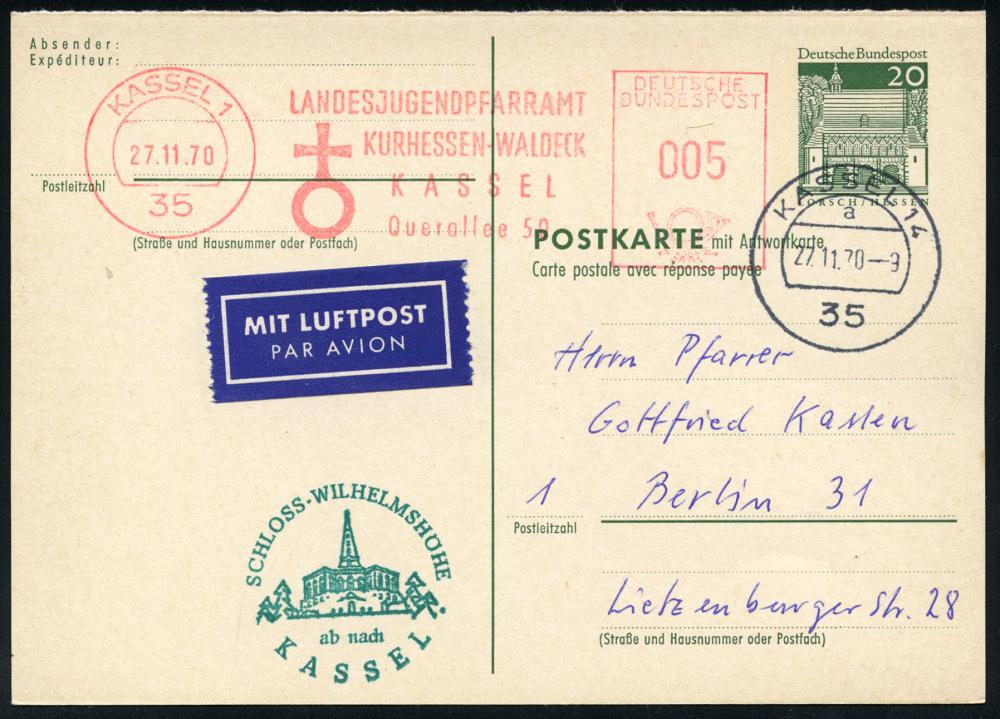 2443 | 18 € | 3500 Kassel Absender-Freistempel : 35 KASSEL 14/ a 1970 (27.11.) 1K-Segment + Zusatzfrankatur 005 Pf. AFS.: 35 KASSEL 1/LANDESJUGENDPFARRAMT/ KURHESSEN-WALDECK (Kreuz auf Globus) Aufwertung für Luftpost-Beförderung + HdN: SCHLOSS WILHELMSHÖHE, klar gest., portorichtige Inl.-Flp.-Kt. n. West-Berlin, seltener Beleg! (Mi.P 94 F + 12.- EUR, 2005) | ![]() | |