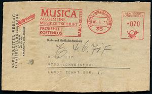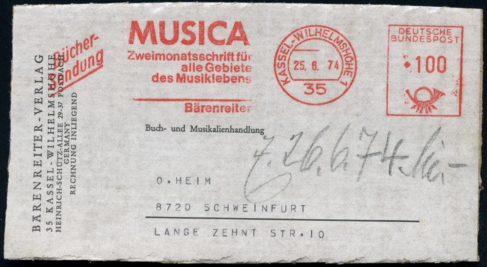 2444 | 18 € | 3500 Kassel Absender-Freistempel : 35 KASSEL-WILHELMSHÖHE 1/ MUSICA/ ALLGEM./ MUSIKZEITSCHRIFT../ BÄRENREITER 1971 (3.6.) AFS Francotyp "Posthorn" 070 Pf. + Zusatz "Büchersendung" auf Verpackungs-Adreßträger, seltene Portostufe! (Dü.E-26) | ![]() | |