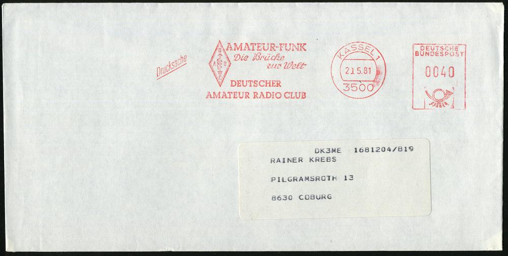 2450 | 16 € | 3500 Kassel Absender-Freistempel : 3500 KASSEL 1/ AMATEUR-FUNK/ DARC/ Die Brücke/ zur Welt/ DEUTSCHER/ AMATEUR RADIO CLUB 1981 (21.5.) seltener AFS Hasler = DARC-Logo , klar gest. Inl.-Bf. (Dü.E-26D) | ![]() | |